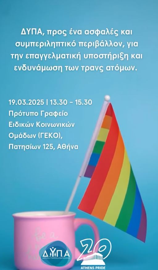 Το Athens Pride, σε συνεργασία με τη ΔΥΠΑ - Δημόσια Υπηρεσία Απασχόλησης σε προσκαλεί σε έναν νέο κύκλο συναντήσεων ενημέρωσης & επαγγελματικής συμβουλευτικής, που έχει σχεδιαστεί για τις ανάγκες των τρανς ατόμων που αναζητούν εργασία.