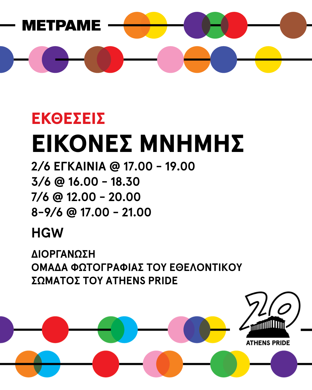 Η έκθεση Εικόνες Μνήμης είναι μια φωτογραφική αναδρομή στα 20 χρόνια του Athens Pride — είκοσι χρόνια πορείας, παρουσίας, αγώνα, αλλά και χαράς, αγκαλιάς και υπερηφάνειας. Μέσα από το βλέμμα των εθελοντών του Pride, ζωντανεύουν στιγμές της ΛΟΑΤΚΙ+ κοινότητας στην Ελλάδα.